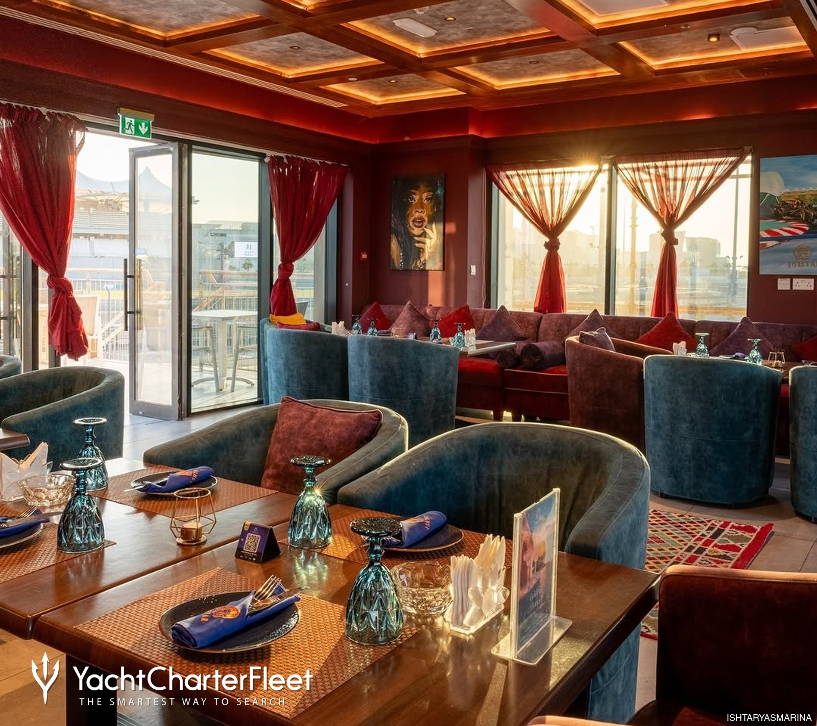 Overlooking the glittering marina, Ishtar’s open-air terrace provides sweeping views that perfectly complement its lively yet sophisticated atmosphere. For those arriving via an Abu Dhabi yacht charter, it offers the ideal spot to step ashore and unwind amid the cosmopolitan energy of Yas Island. As night falls, live performances and the hum of conversation fill the air, creating an ambience that captures the essence of Middle East yacht charter living.