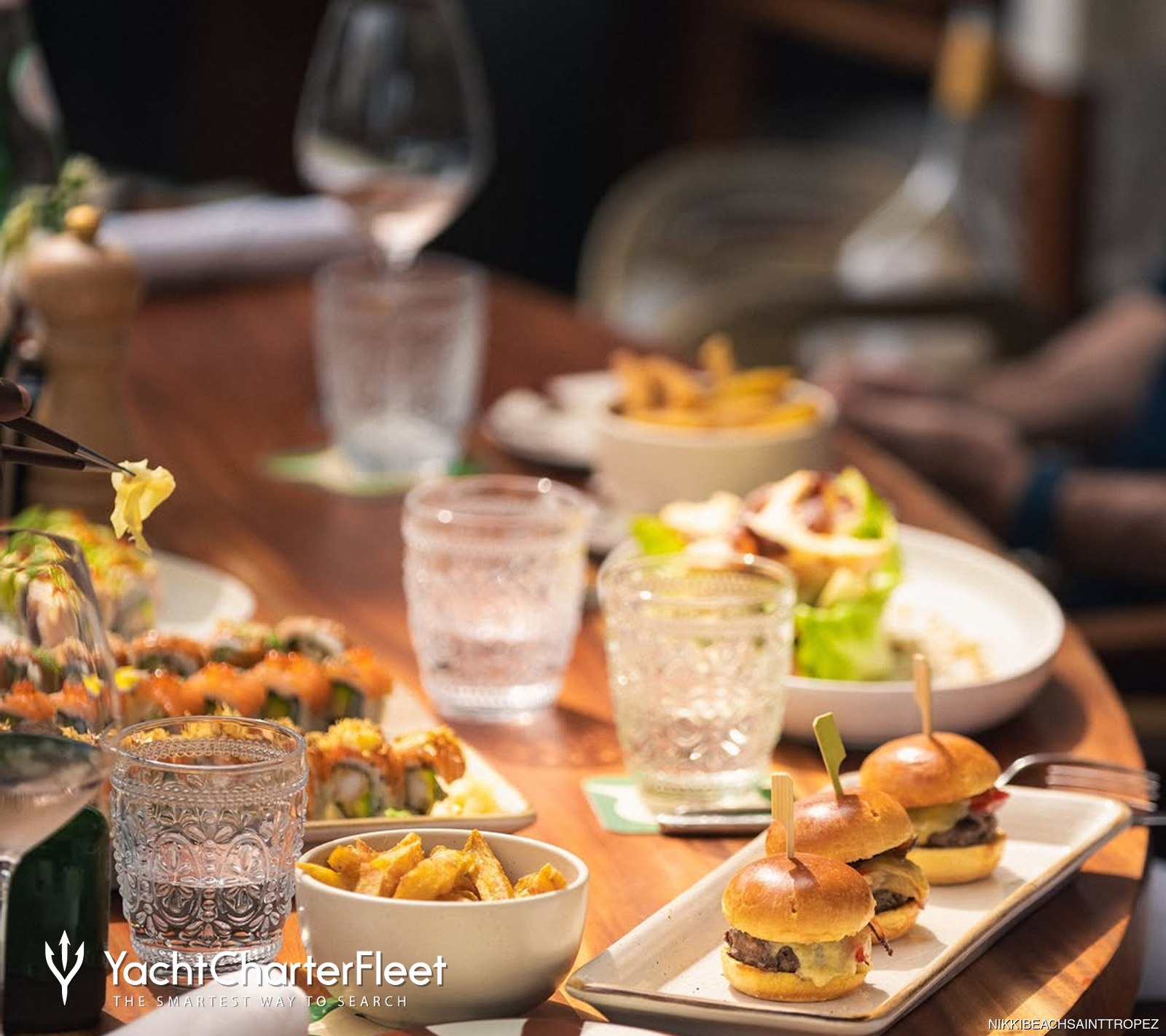 The restaurant serves as the heart of the club, featuring dishes inspired by international flavors while maintaining a distinctly Mediterranean character. Locally sourced ingredients and creative presentations give each plate a light, summery appeal that pairs perfectly with the relaxed rhythm of the coast. Many yacht charter visitors arrive for lunch and stay through the afternoon, as live music and DJ sets bring a lively yet unhurried mood to the scene.