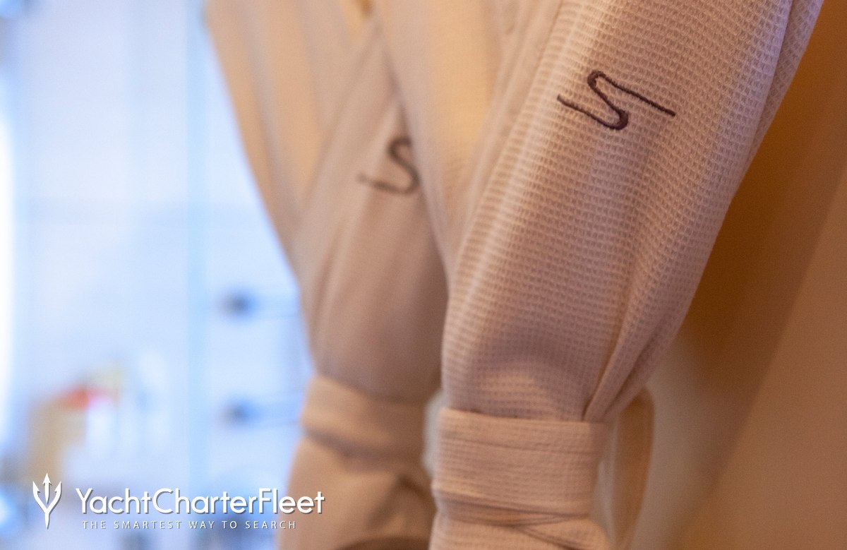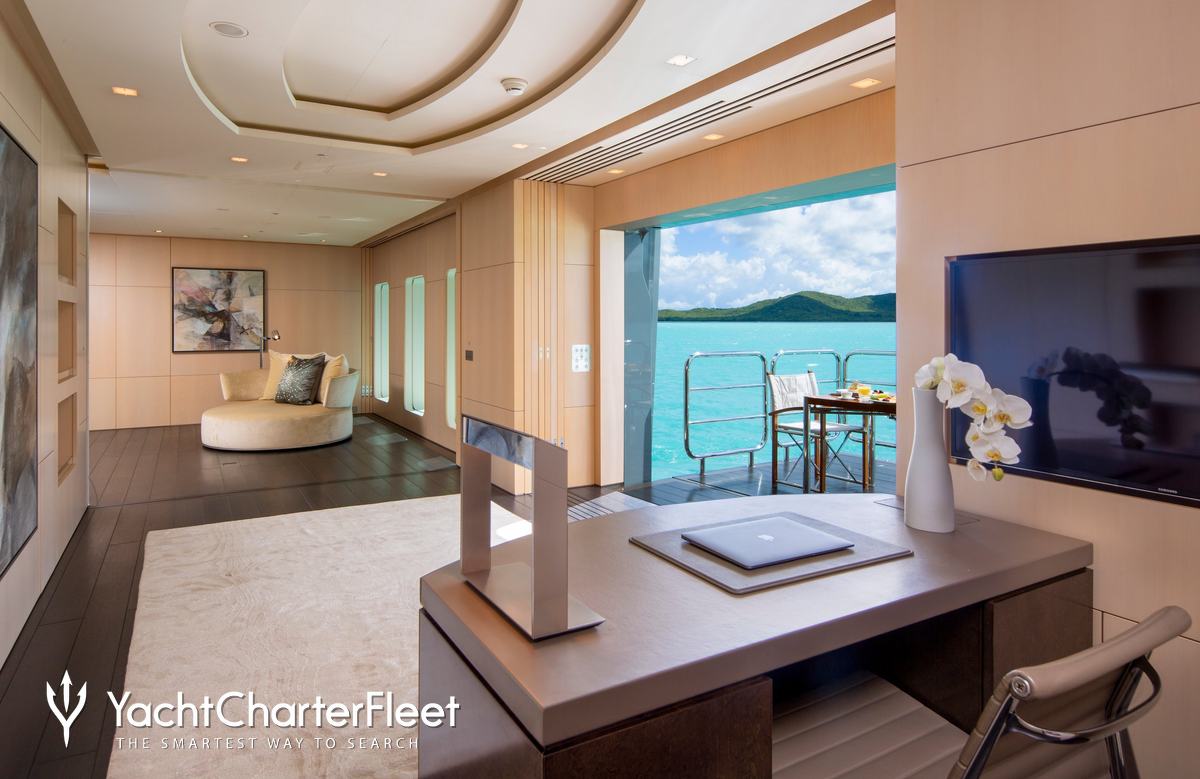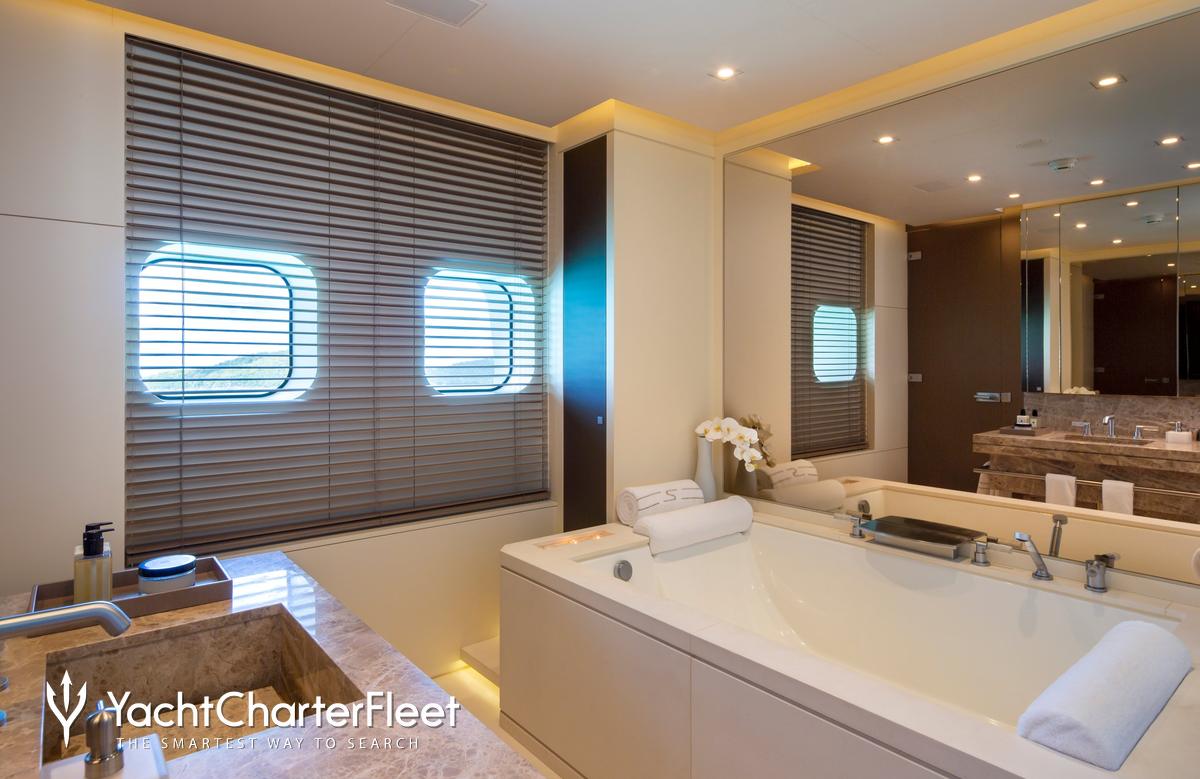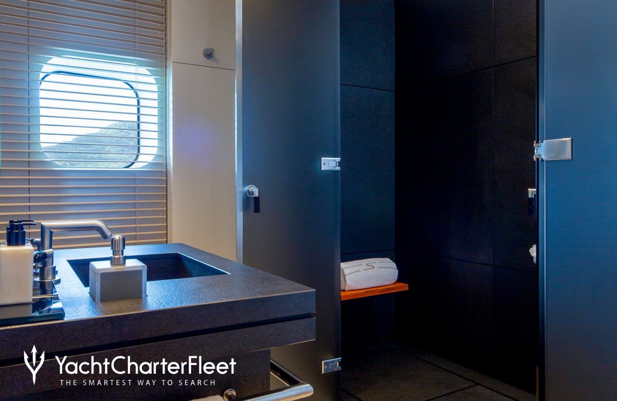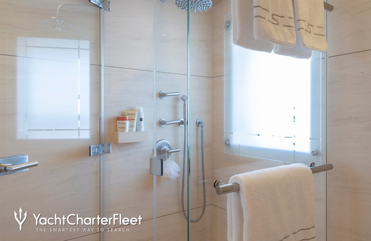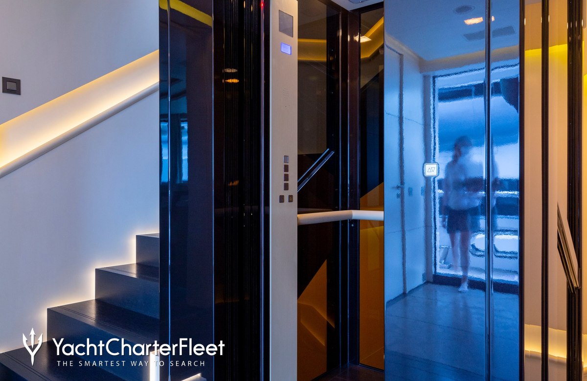 Whatever your activities on your charter, you'll find some impressive features are seamlessly integrated to help you including an elevator, making any part of the yacht quickly and easily accessible. Satellite communication systems keep you in touch wherever you voyage and make your evenings more memorable with stunning underwater lights. With Wi-Fi connectivity you don't have to lose contact with the outside world, unless you want to plus you can stay comfortable on board whatever the weather, with air conditioning during your charter.