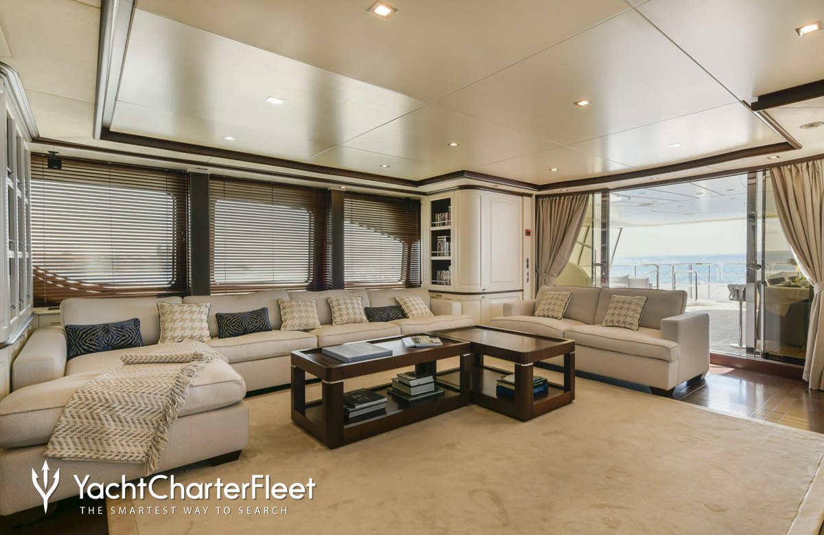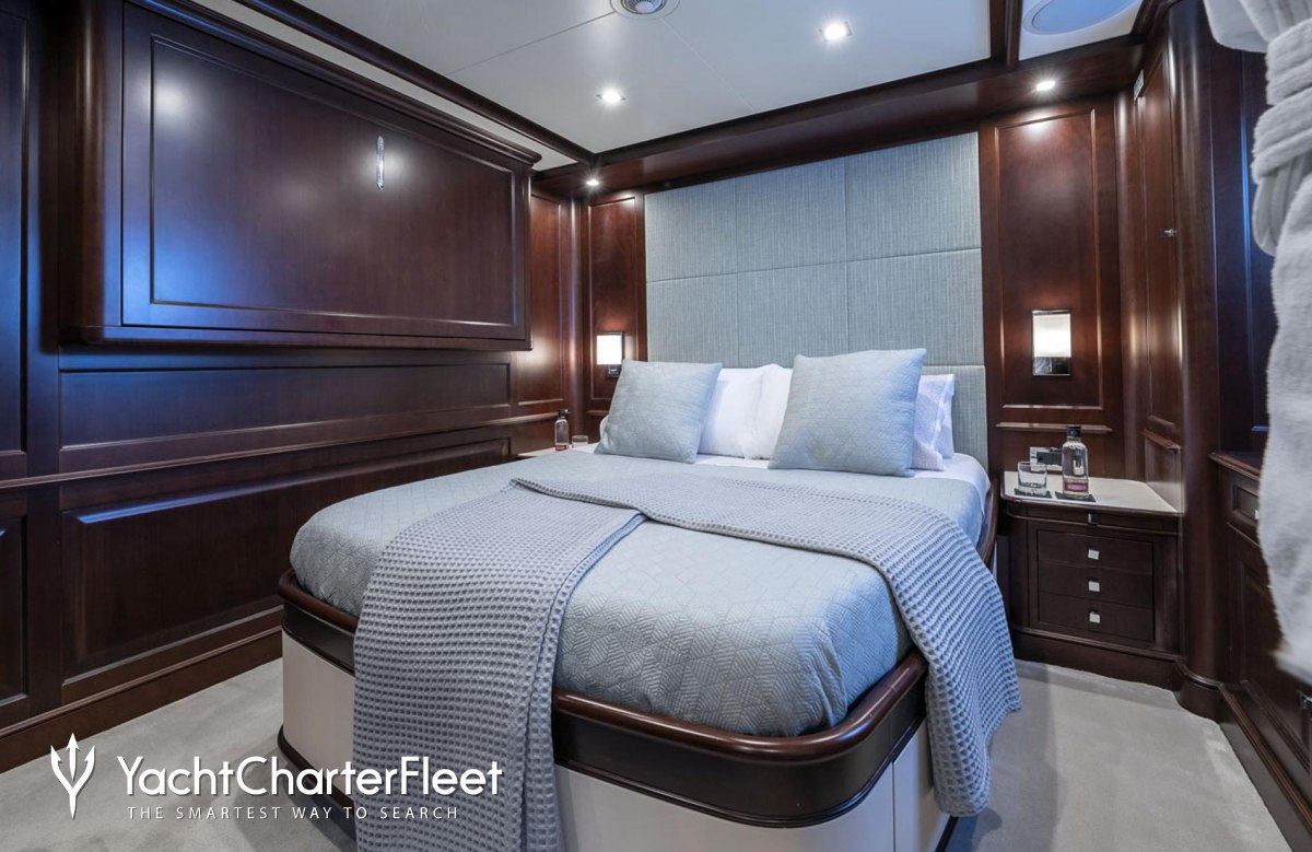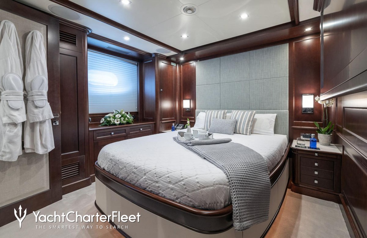 Built with a GRP hull and GRP superstructure, she benefits from a semi-displacement hull to provide exceptional seakeeping and impressive speeds. Powered by twin Caterpillar engines, she comfortably cruises at 10 knots, reaches a maximum speed of 16 knots with a range of up to 3,800 nautical miles from her 38,000 litre fuel tanks. An advanced stabilisation system on board reduces the side-to-side roll of the yacht and promises guests exceptional comfort levels at anchor or when underway.