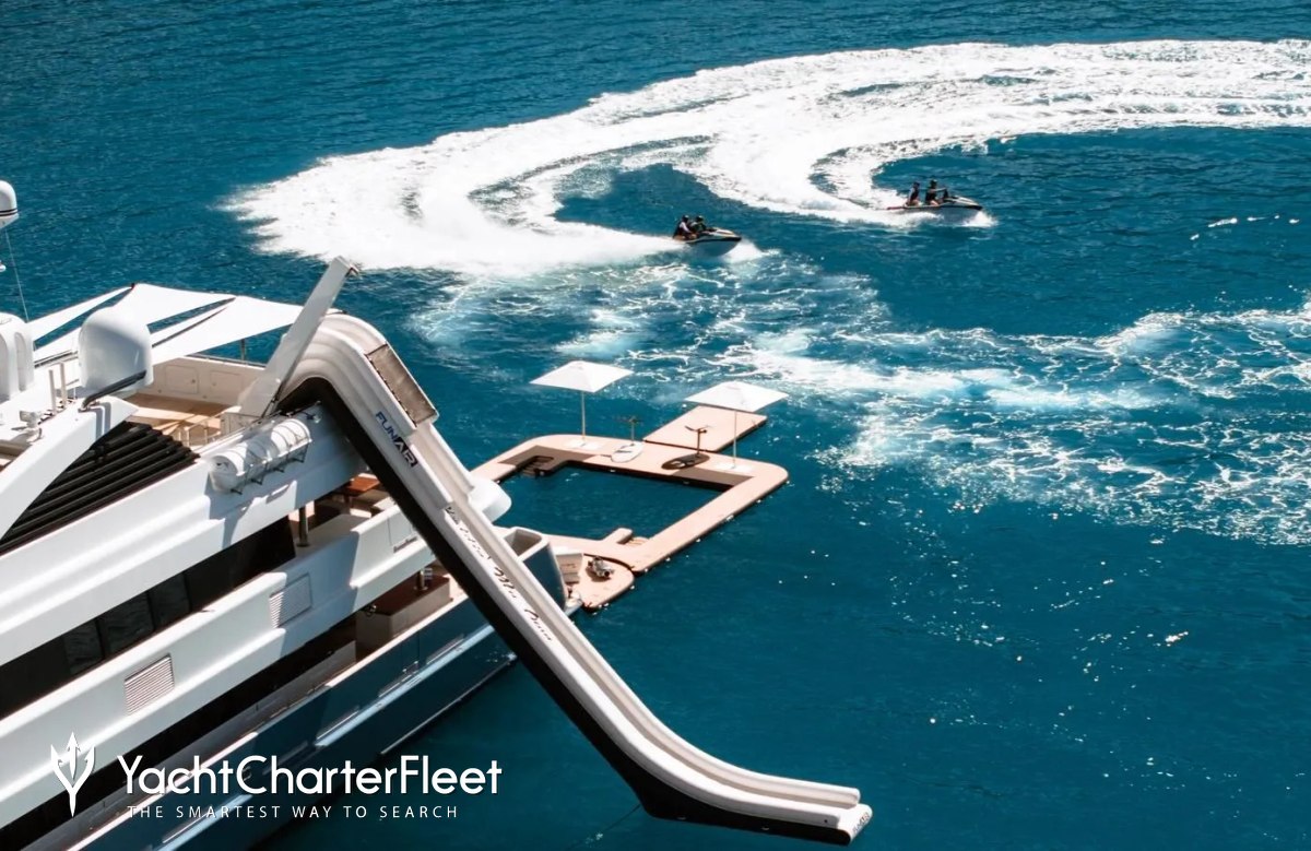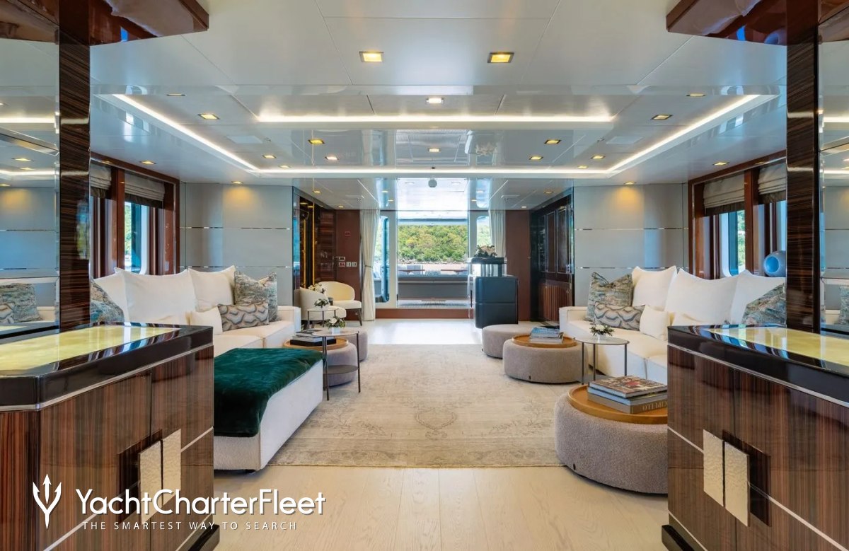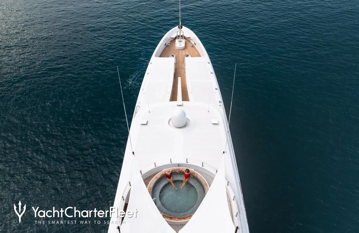 Built with a steel hull and aluminium superstructure, she offers greater on-board space and is more stable when at anchor thanks to her full-displacement hull. Powered by twin Caterpillar engines, she comfortably cruises at 12 knots, reaches a maximum speed of 17 knots with a range of up to 5,000 nautical miles from her 83,500 litre fuel tanks at 11 knots. An advanced stabilisation system on board reduces the side-to-side roll of the yacht and promises guests exceptional comfort levels at anchor or when underway.