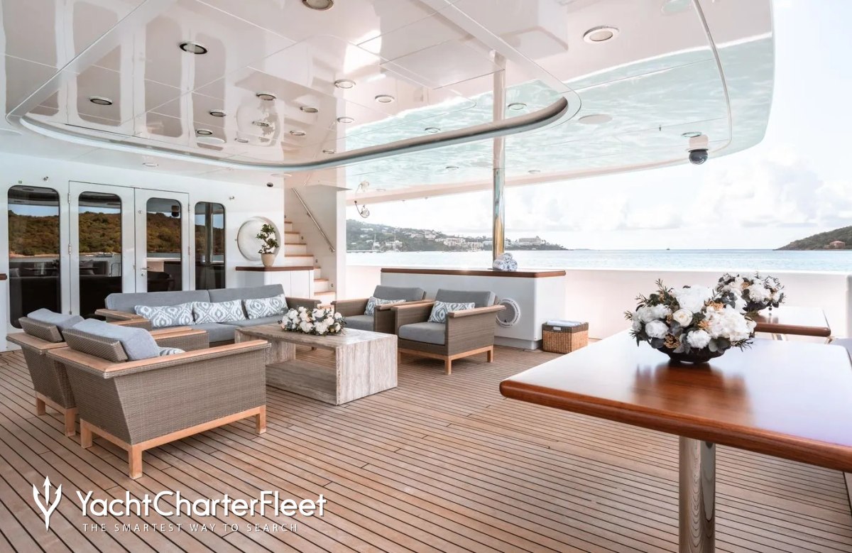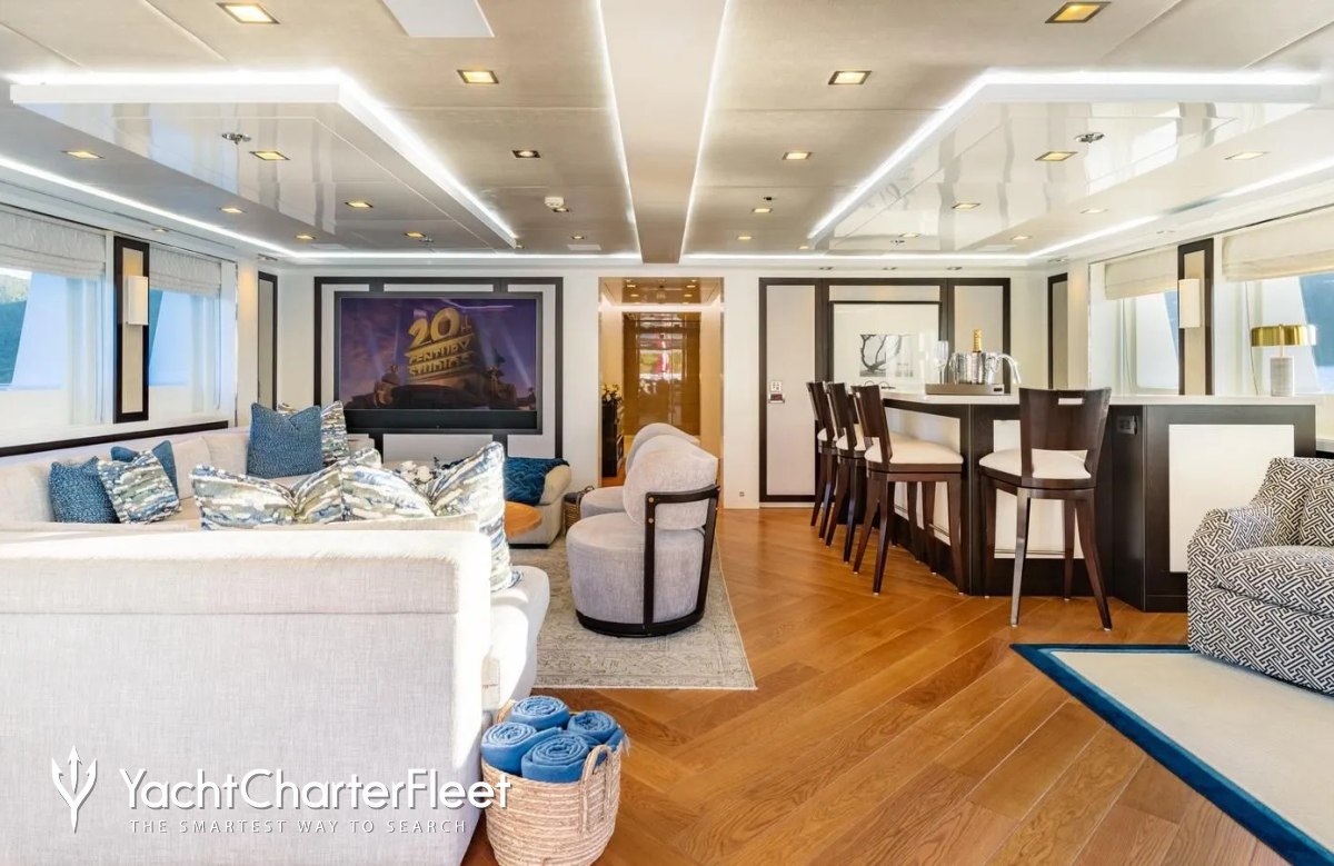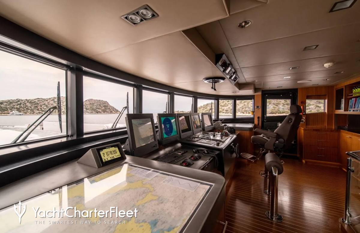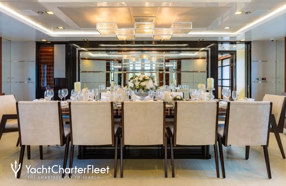 Built with a steel hull and aluminium superstructure, she offers greater on-board space and is more stable when at anchor thanks to her full-displacement hull. Powered by twin Caterpillar engines, she comfortably cruises at 12 knots, reaches a maximum speed of 17 knots with a range of up to 5,000 nautical miles from her 83,500 litre fuel tanks at 11 knots. An advanced stabilisation system on board reduces the side-to-side roll of the yacht and promises guests exceptional comfort levels at anchor or when underway.