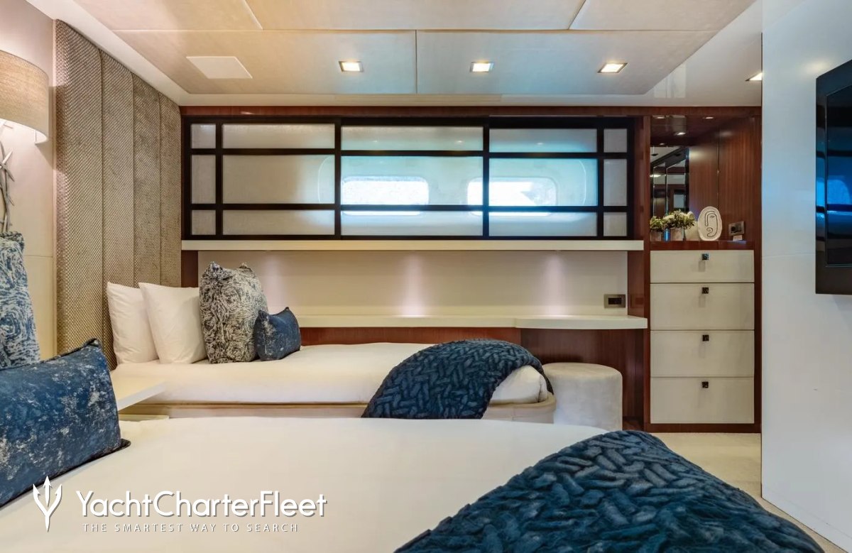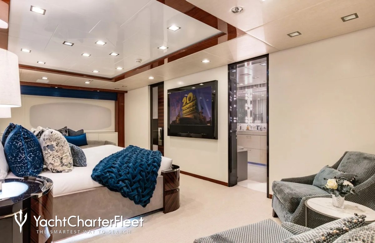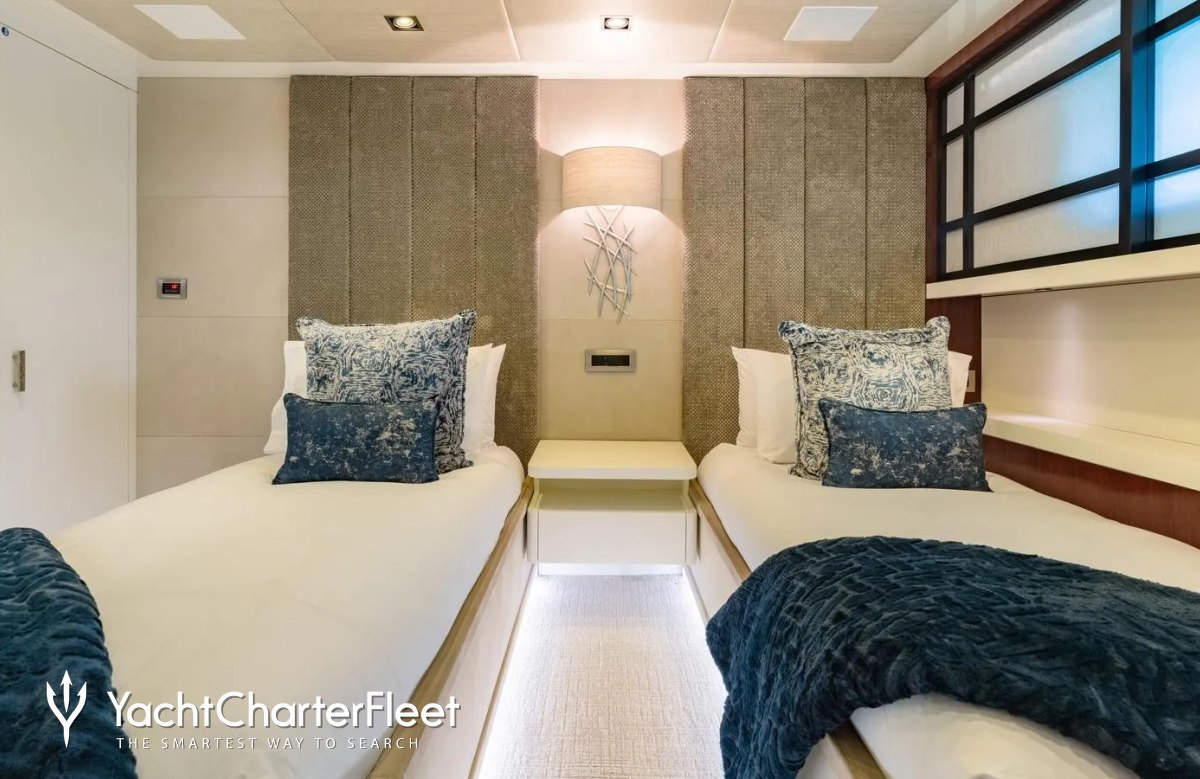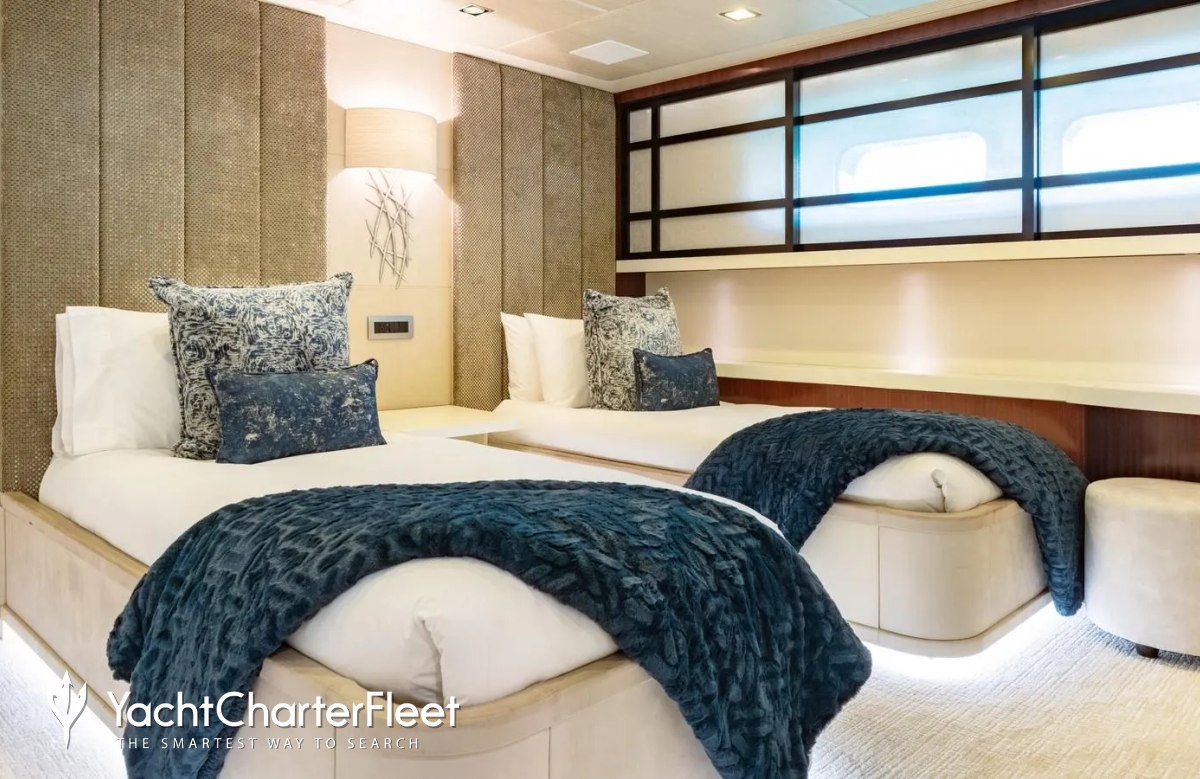 Holdin' My Own offers guest accommodation for up to 12 guests in 6 suites comprising a master suite, one VIP cabin, two double cabins and two twin cabins. There are 8 beds in total, including 4 king and 4 singles. She is also capable of carrying up to 13 crew onboard to ensure a relaxed luxury yacht charter experience.