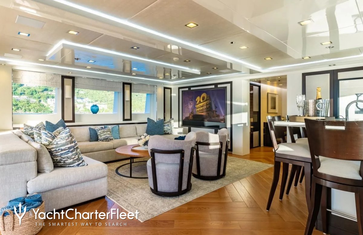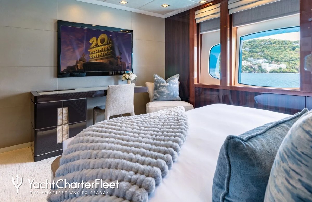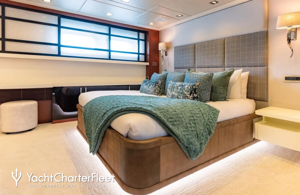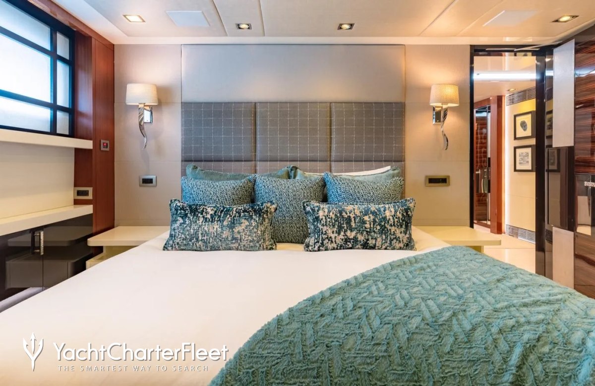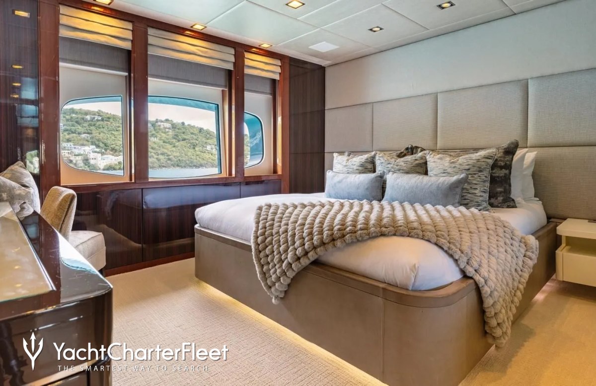 Holdin' My Own offers guest accommodation for up to 12 guests in 6 suites comprising a master suite, one VIP cabin, two double cabins and two twin cabins. There are 8 beds in total, including 4 king and 4 singles. She is also capable of carrying up to 13 crew onboard to ensure a relaxed luxury yacht charter experience.