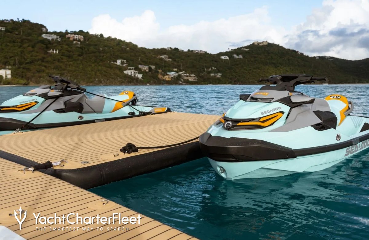 When not cruising Holdin' My Own has onboard an incredible selection of water toys and accessories for you and your guests to connect with the waters around you. Principle among these are Flyboards, experience flying in and out of the water with the latest in high adrenaline watersport. Another excellent feature are waterslides for guests of all ages to enjoy. Guests can feel the wind in their hair and jump the waves on one of the two Yamaha FX SVHO Supercharged WaveRunners. If that isn't enough Holdin' My Own also features towable toys, waterskis, a Kite Surfer, scuba diving equipment, a seabob and much more. Holdin' My Own features two tenders, but leading the pack is a 13.11m/43' Freeman Chase Tender to transport you in style.