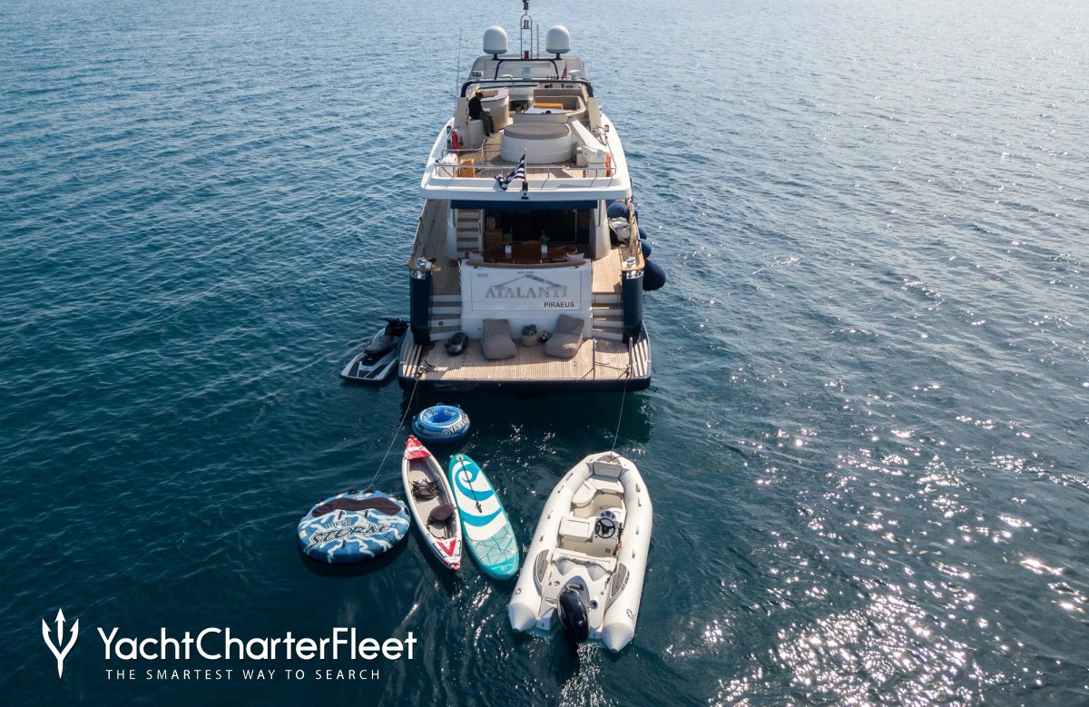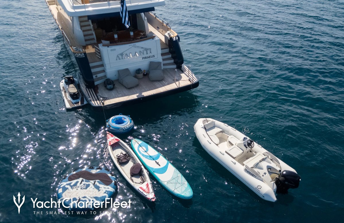 When not cruising Atalanti has onboard an incredible selection of water toys and accessories for you and your guests to connect with the waters around you. Take to the sea on a Jet Ski offering you power and control on the water. Also there are towable toys offering fun and adventure. Another excellent feature are waterskis that are hugely entertaining whether you are a beginner or a seasoned pro. If that isn't enough Atalanti also features scuba diving equipment, a seabob, wakeboards, kayaks, fishing equipment. When it's time to travel from land to see, it couldn't be easier with a 4.4m/14'5" Avon Tender.