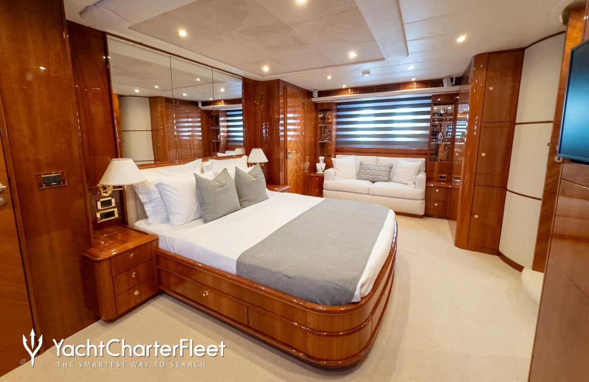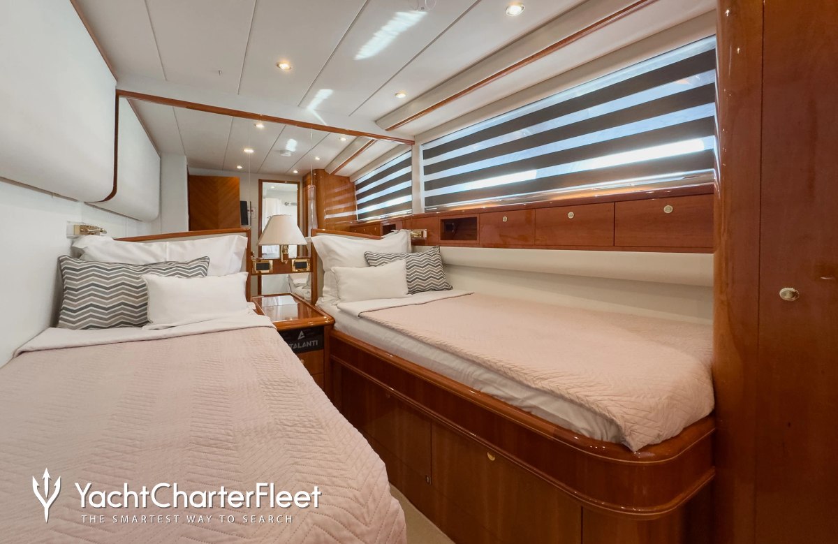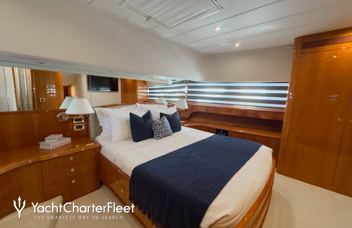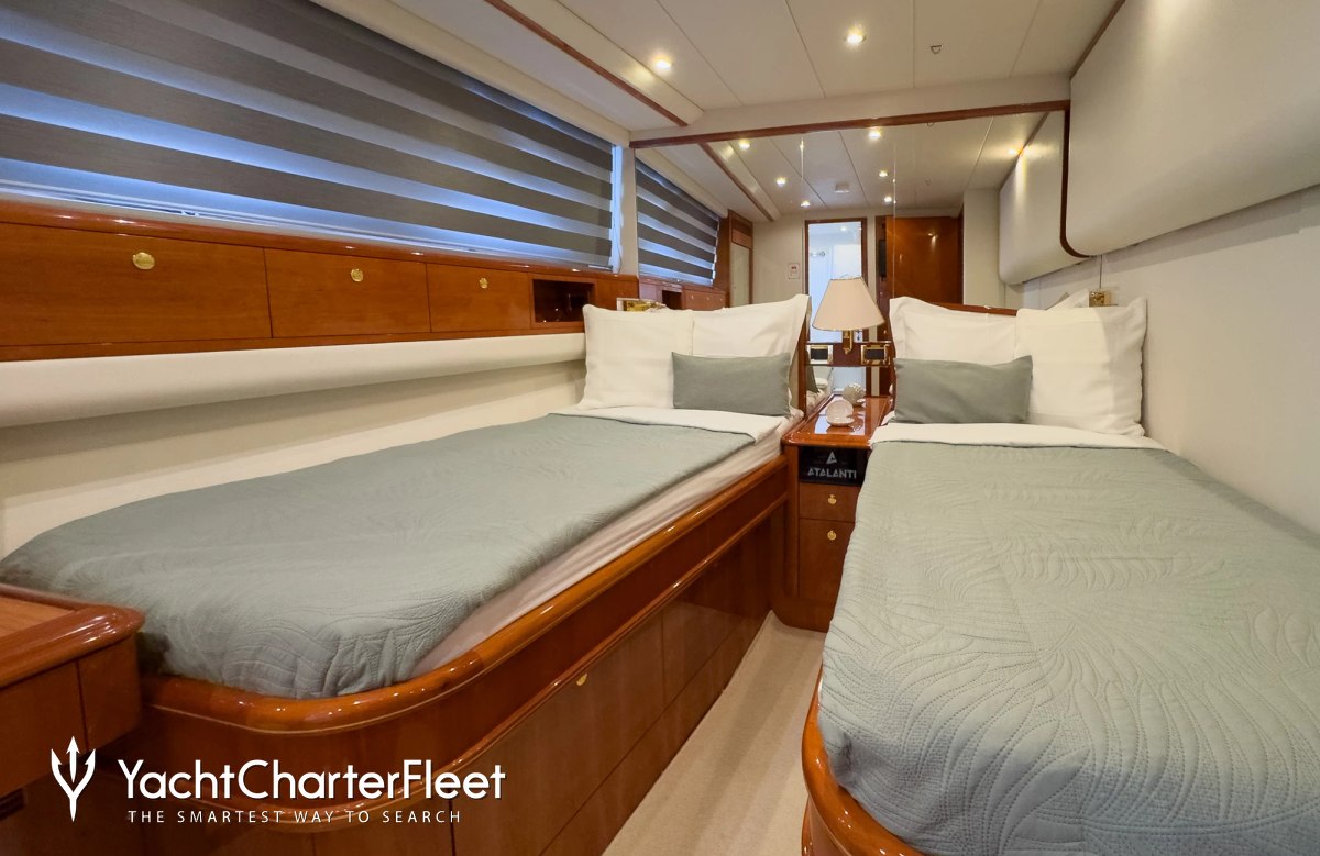 Families will particularly love Atalanti thanks to her child-friendly setup. She offers guest accommodation for up to 10 guests with a layout comprising a master suite, one VIP cabin and two twin cabins. There are 8 beds in total, including 2 queen, 4 singles and 2 pullmans. She is also capable of carrying up to 5 crew onboard to ensure a relaxed luxury yacht charter experience.