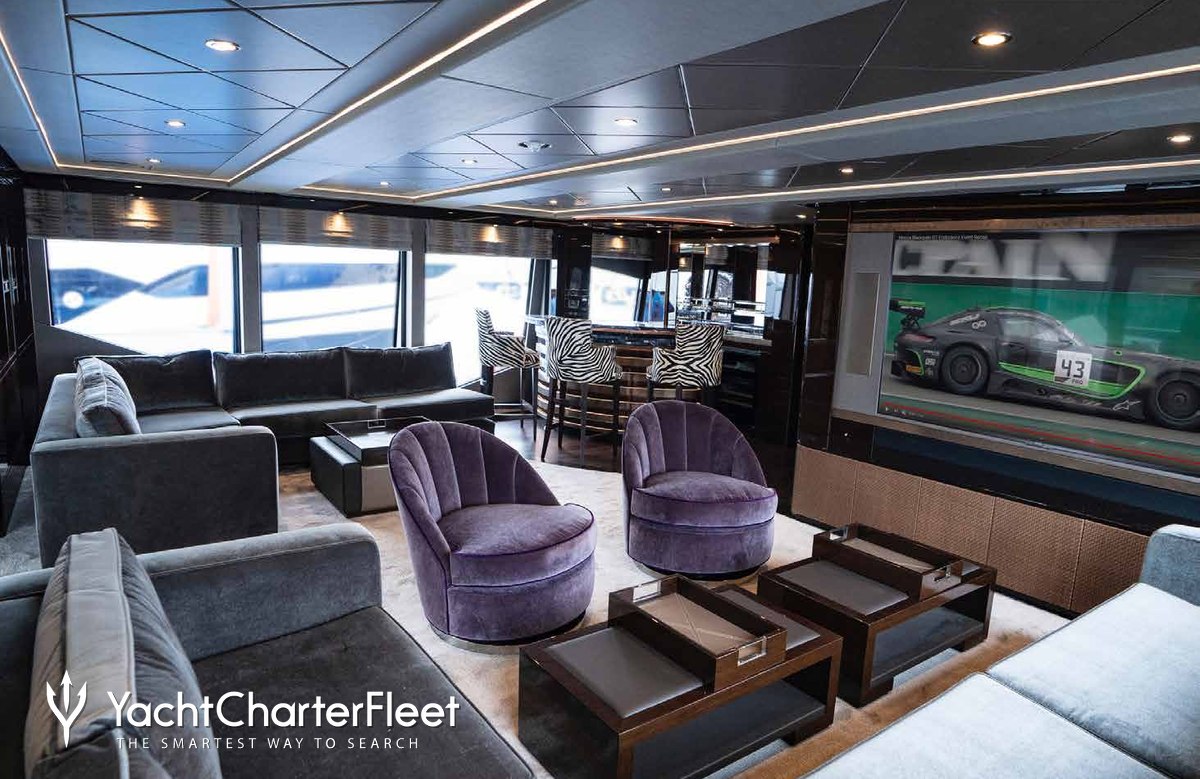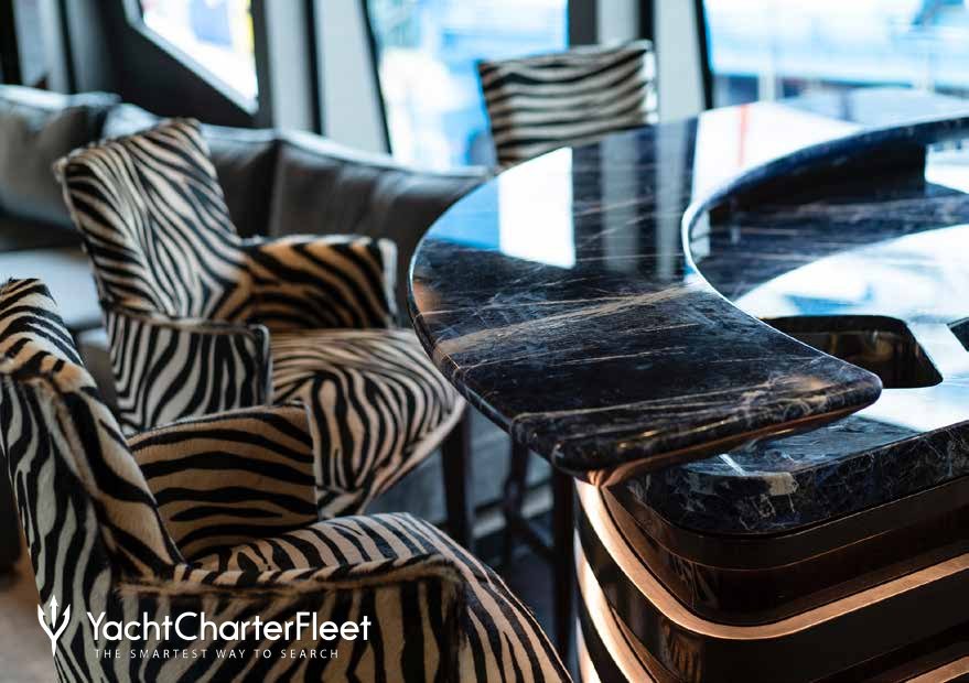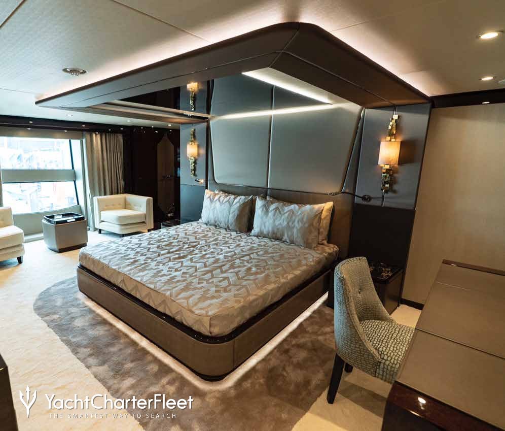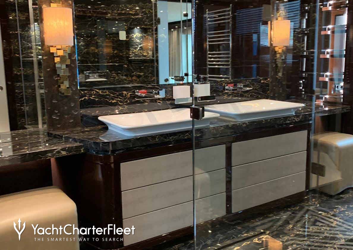 Built with a GRP hull and GRP superstructure, she has impressive speed and great efficiency thanks to her planing hull. Powered by twin MTU engines, she comfortably cruises at 14 knots, reaches a maximum speed of 20 knots with a range of up to 1,116 nautical miles from her 28,600 litre fuel tanks at 12 knots. An advanced stabilisation system on board reduces the side-to-side roll of the yacht and promises guests exceptional comfort levels at anchor or when underway.