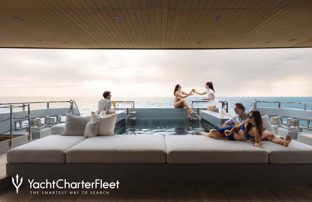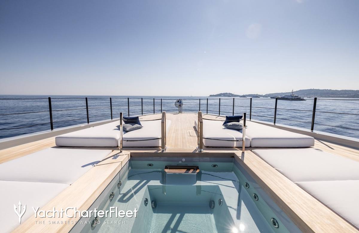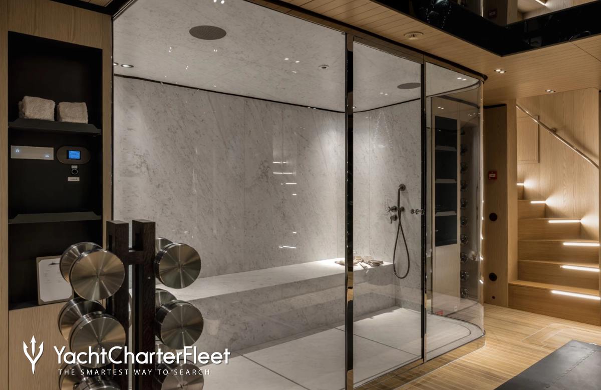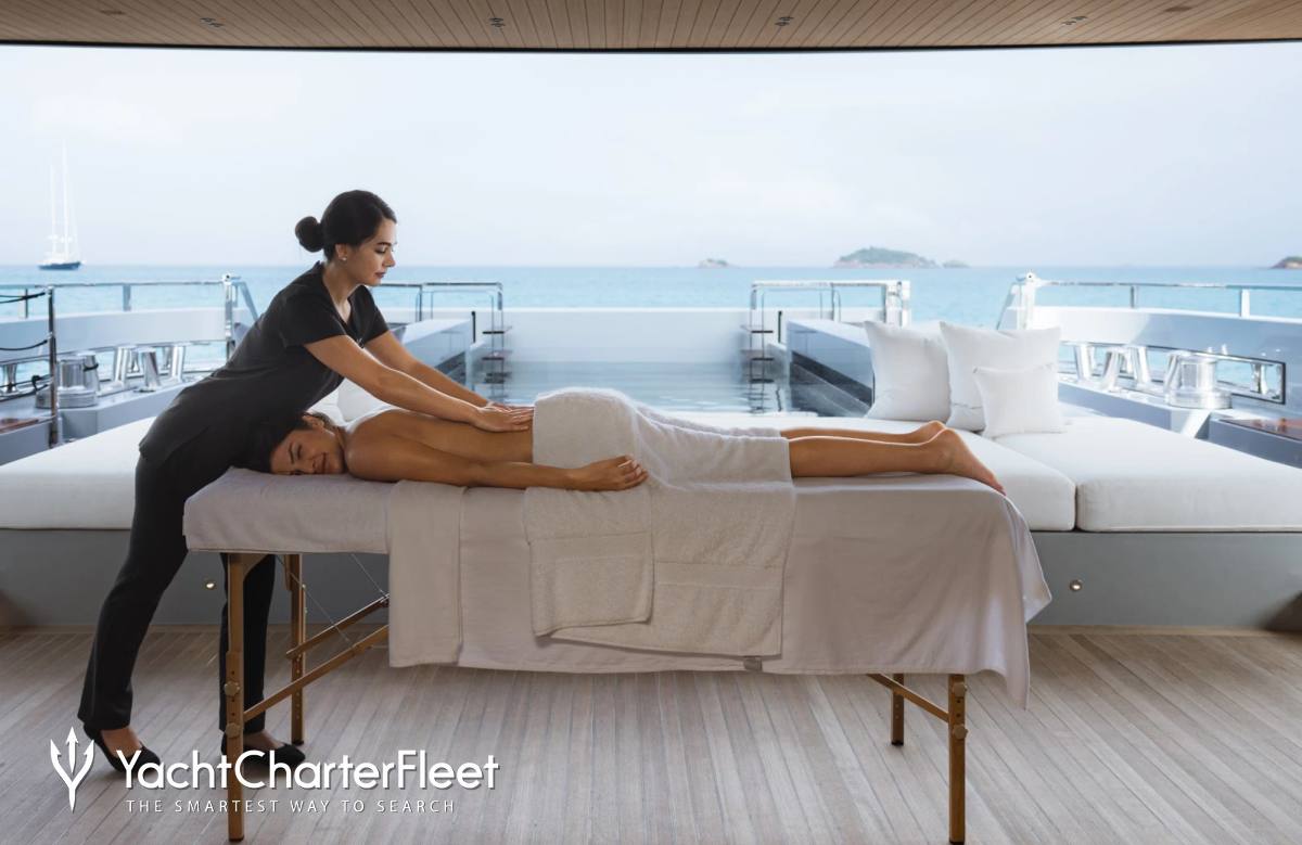 A charter on Virtuosity is comfortable and convenient thanks to the provided amenities such as a serene luxury spa, for the utmost in relaxation. Soothe tired limbs and reinvigorate yourself in the sauna and take a plunge in the pool under the sun. Make your day truly exceptional at the beach club and in addition you can visit the well-equipped gym so that you can keep up with your fitness routine at sea. Soak up the bubbles in style in the deck jacuzzi.