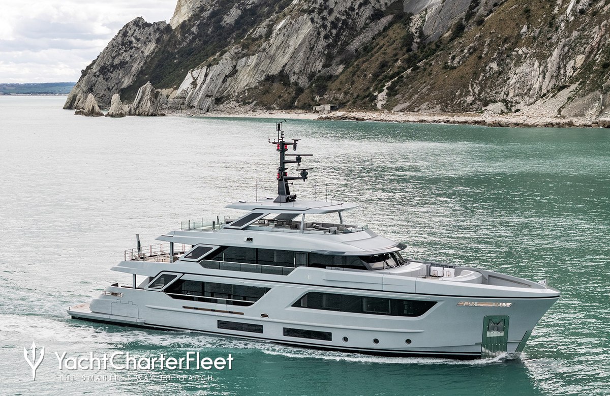 Built with a steel hull and aluminium superstructure, she offers greater on-board space and is more stable when at anchor thanks to her full-displacement hull. Powered by twin Caterpillar engines, she comfortably cruises at 10 knots, reaches a maximum speed of 14 knots with a range of up to 5,500 nautical miles from her 48,000 litre fuel tanks at cruising speed.