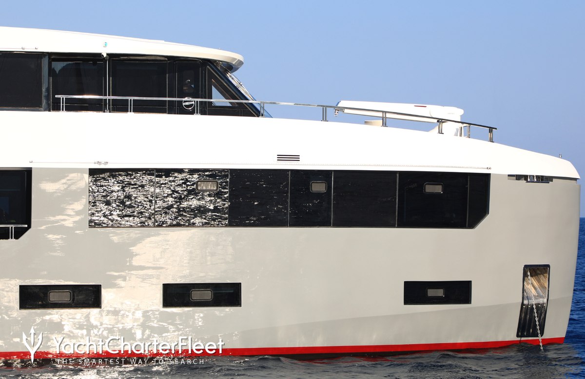 Built with a steel hull and aluminium superstructure, she offers greater on-board space and is more stable when at anchor thanks to her full-displacement hull. Powered by twin MAN engines, she comfortably cruises at 8 knots, reaches a maximum speed of 12 knots with a range of up to 3,500 nautical miles from her 16,700 litre fuel tanks.