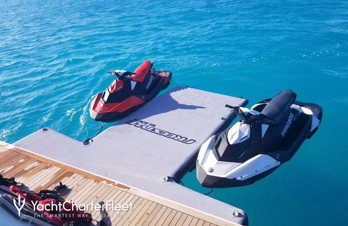Italian Yacht 85 knows a thing or two about fun on the water, with a selection of water toys and accessories for you and your guests to enjoy whilst on charter. Take to the sea on the Jet Skis offering you power and control on the water. Another excellent feature are SEABOBs providing agile cruising and diving.