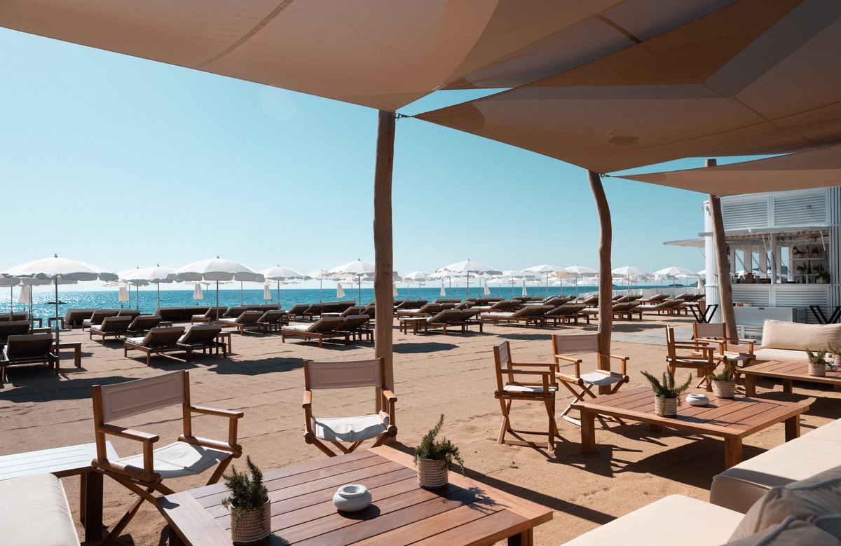 Club Les Palmiers occupies a wide stretch of beach where turquoise water meets fine, pale sand. Whitewashed wood and natural tones create a serene setting that reflects St Tropez’s coastal character. Sunbeds line the waterfront, giving guests a clear view of the Mediterranean while enjoying attentive yet unobtrusive service.