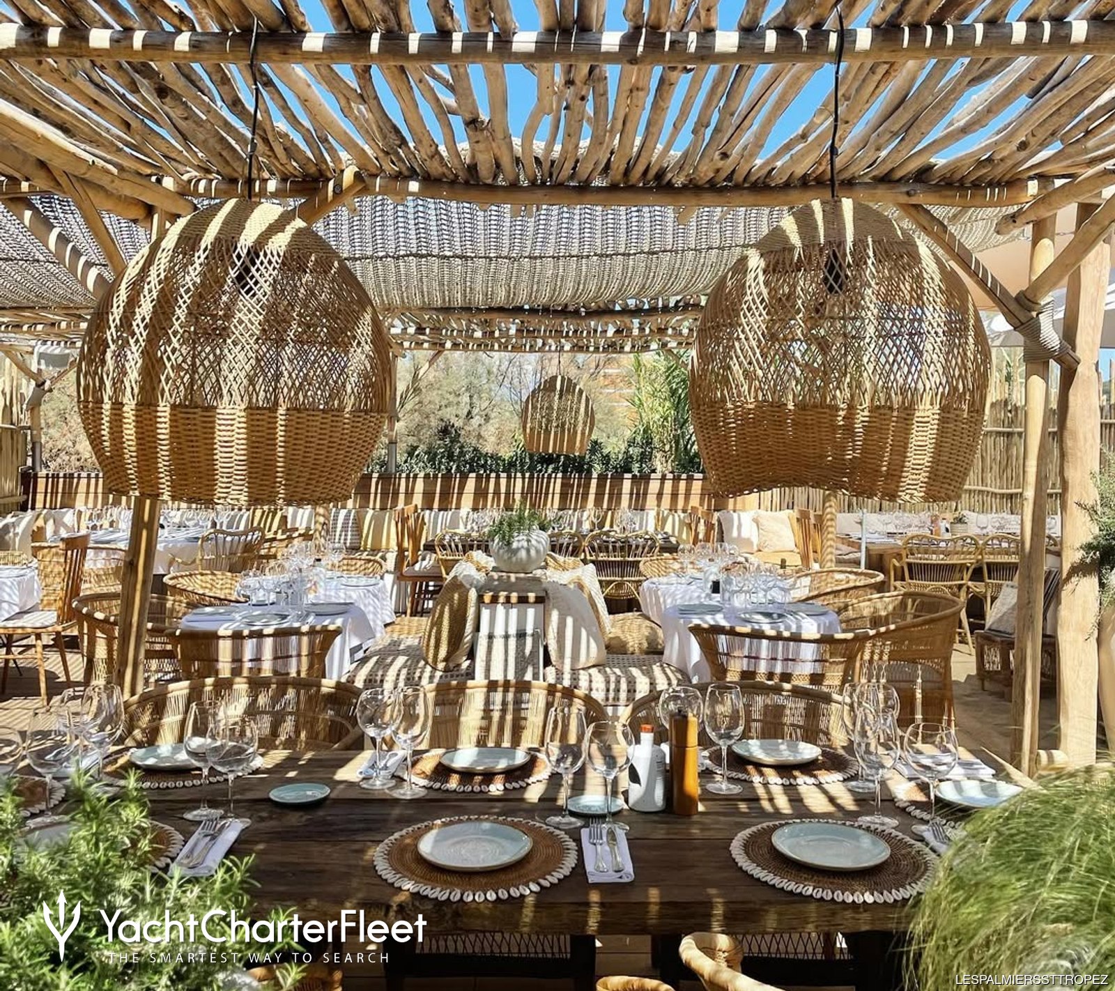 As the sun begins to fade, the beach glows in soft golden light and the sea turns deep blue. Evening at Les Palmiers unfolds slowly, marked by calm conversation and gentle music carried on the breeze. Whether enjoyed as part of a longer stay or a single afternoon ashore, the experience captures what many seek in this region: tranquility, flavor, and a sense of effortless style.
