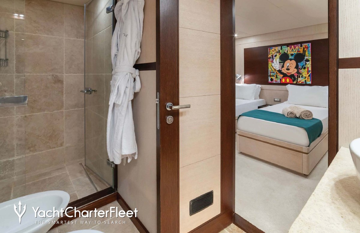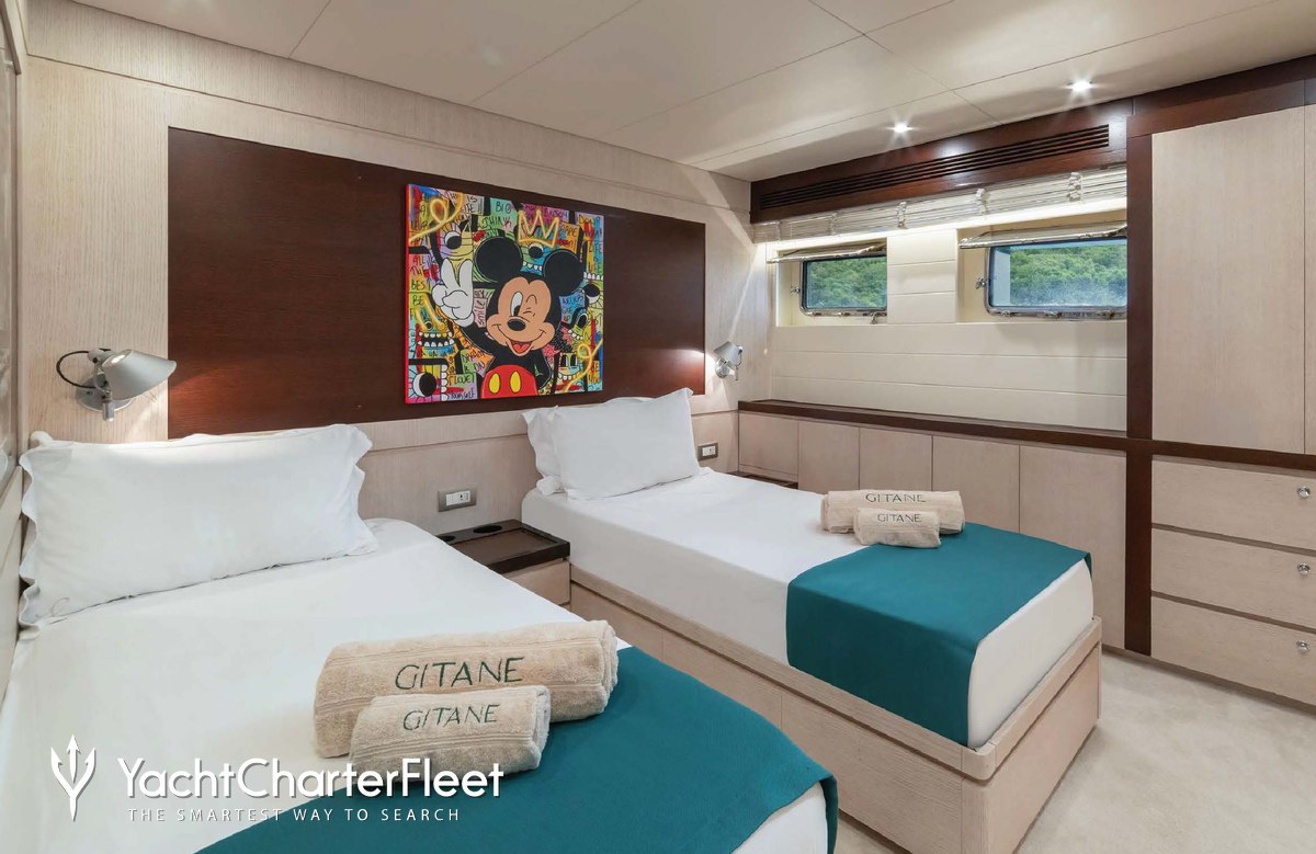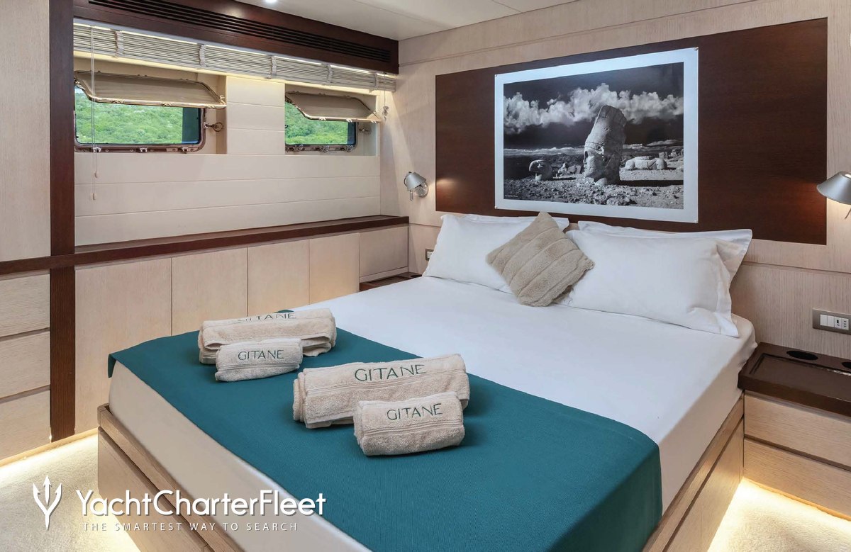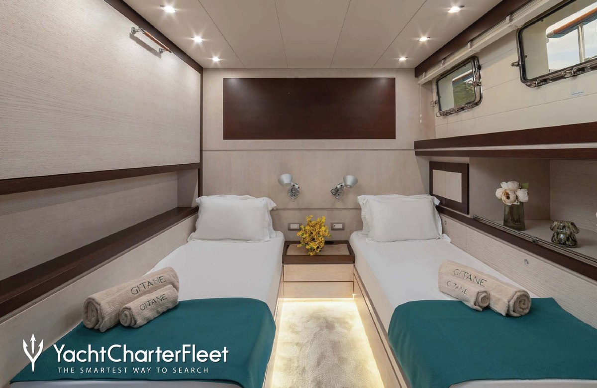 Built in 2007, Gitane offers guest accommodation for up to 9 guests in 4 suites comprising a master suite, one VIP cabin and two twin cabins. There are 6 beds in total, including 1 king, 1 queen and 4 singles. She is also capable of carrying up to 6 crew onboard to ensure a relaxed luxury yacht charter experience.