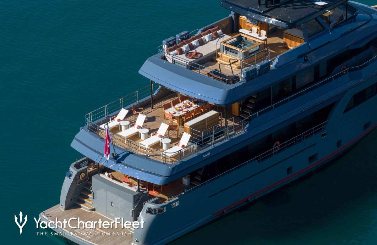 Built with a steel hull and aluminium superstructure, she offers greater on-board space and is more stable when at anchor thanks to her full-displacement hull. Powered by twin Caterpillar engines, she comfortably cruises at 10 knots, reaches a maximum speed of 13 knots with a range of up to 3,960 nautical miles from her 41,866 litre fuel tanks at cruising speed.