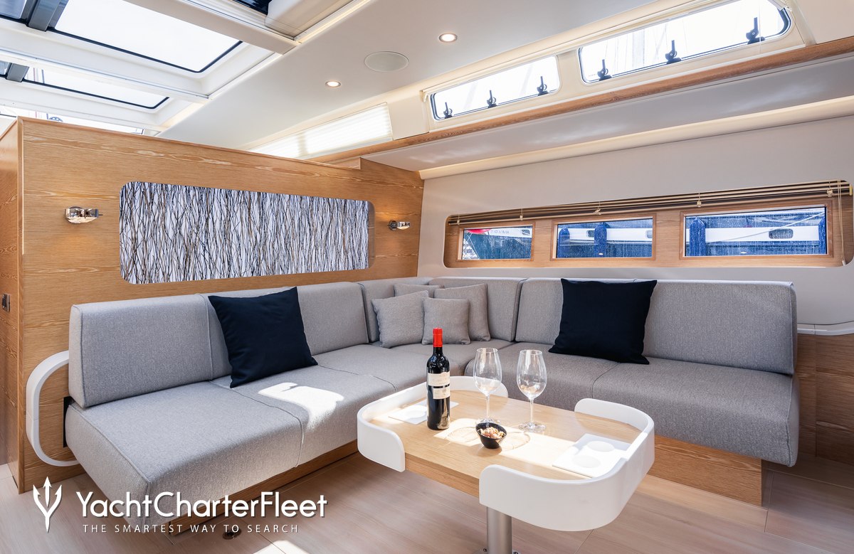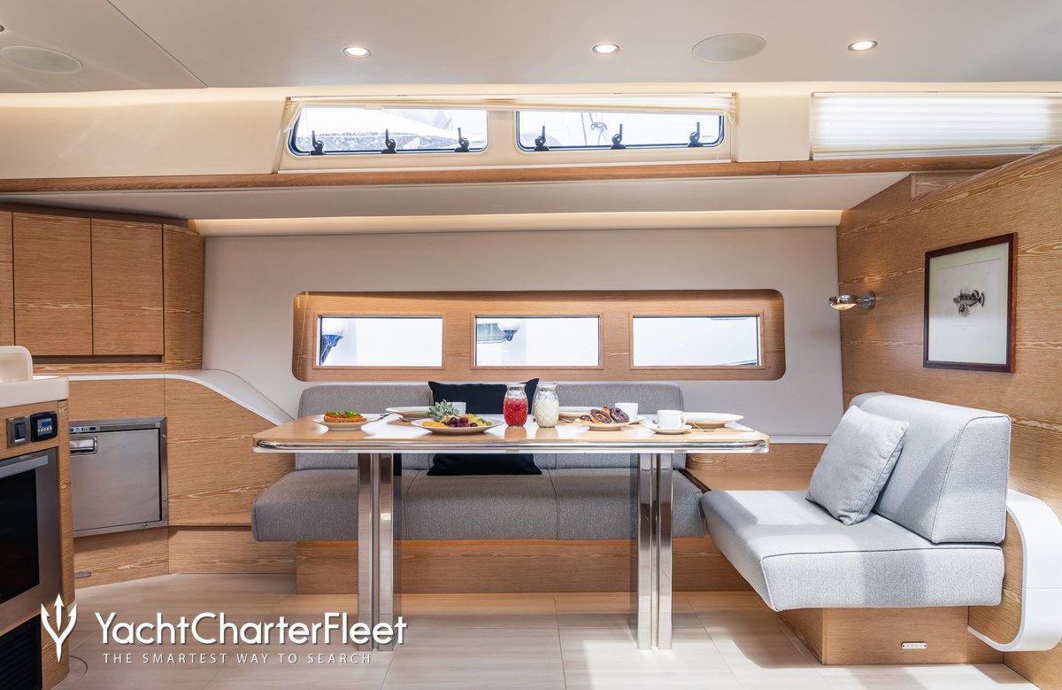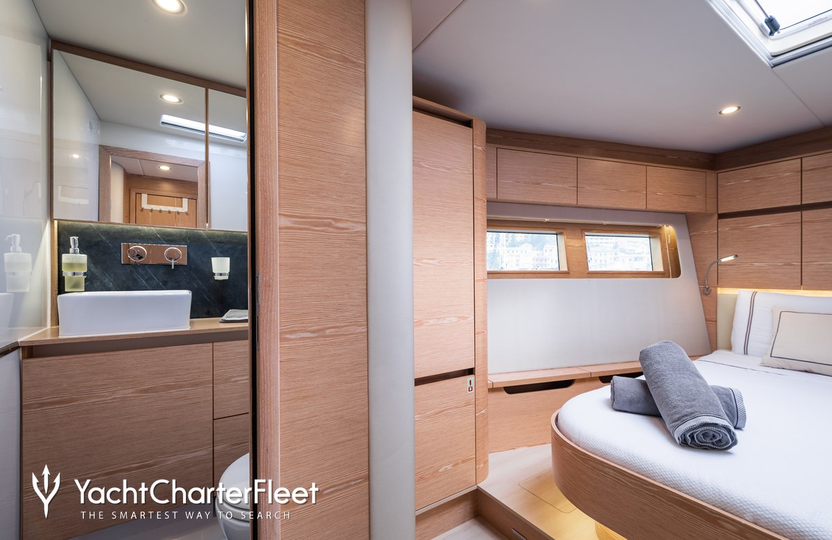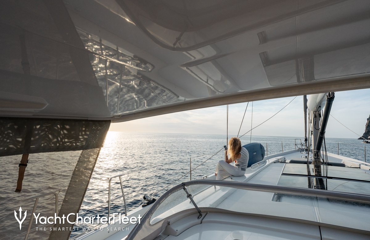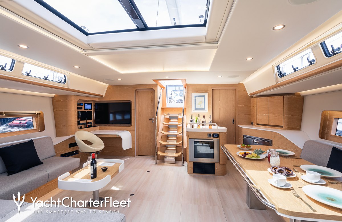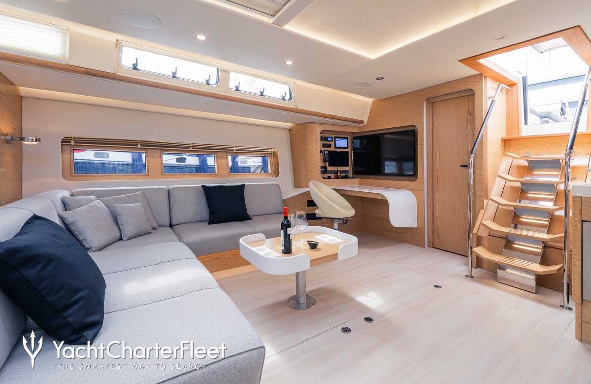The interior impresses with its open spaces and natural light. The panoramic saloon invites you to relax with sea views, while the fully equipped galley allows you to prepare meals as if you were at home.