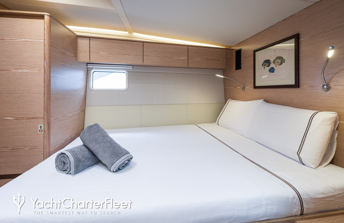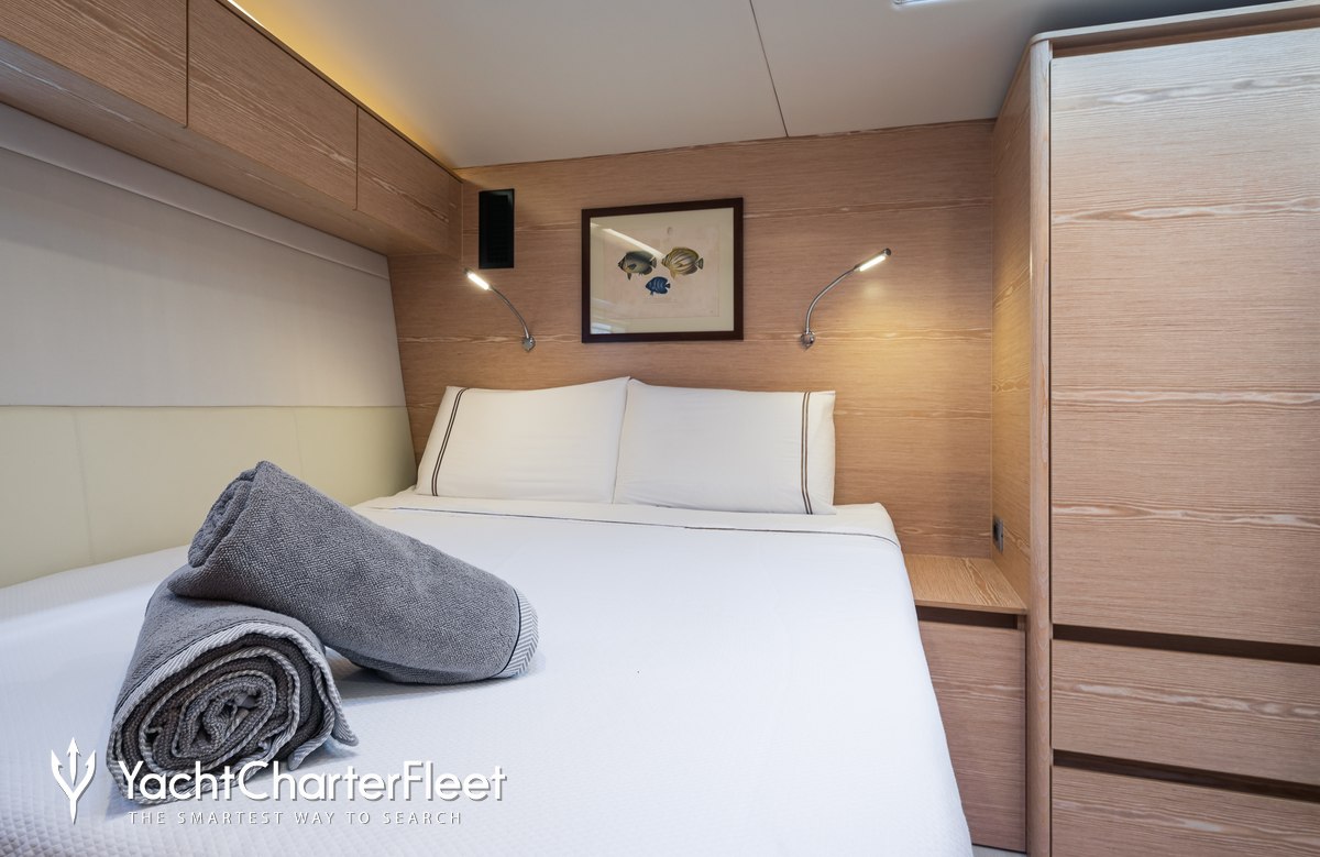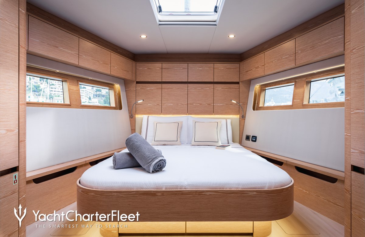 Families will particularly love Agarimo Six thanks to her child-friendly setup. Built in 2017, She offers guest accommodation for up to 6 guests with a layout comprising a master suite and one double cabin. There are 4 beds in total, including 1 queen, 1 double, 2 singles and 2 pullmans. She is also capable of carrying up to 2 crew onboard to ensure a relaxed luxury yacht charter experience.