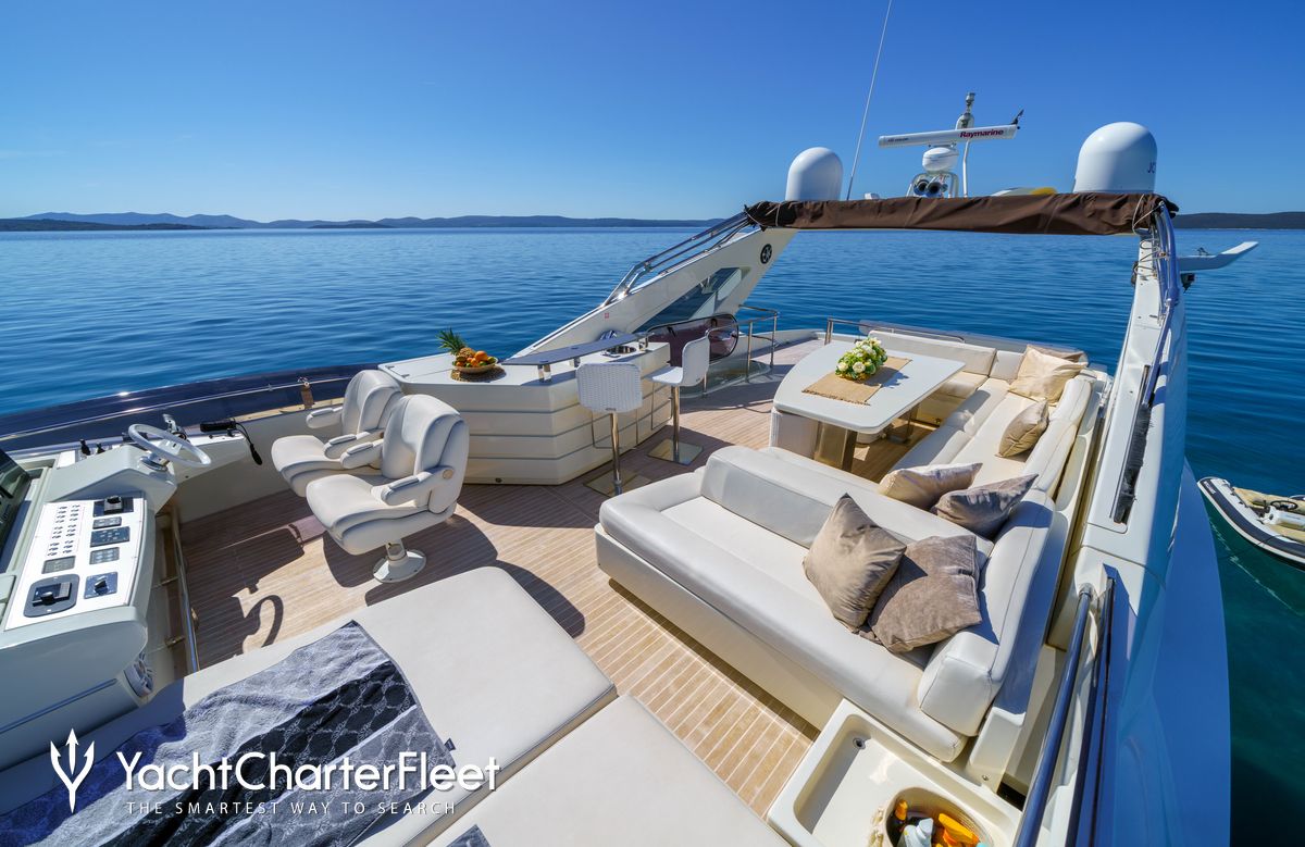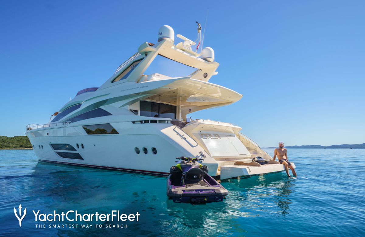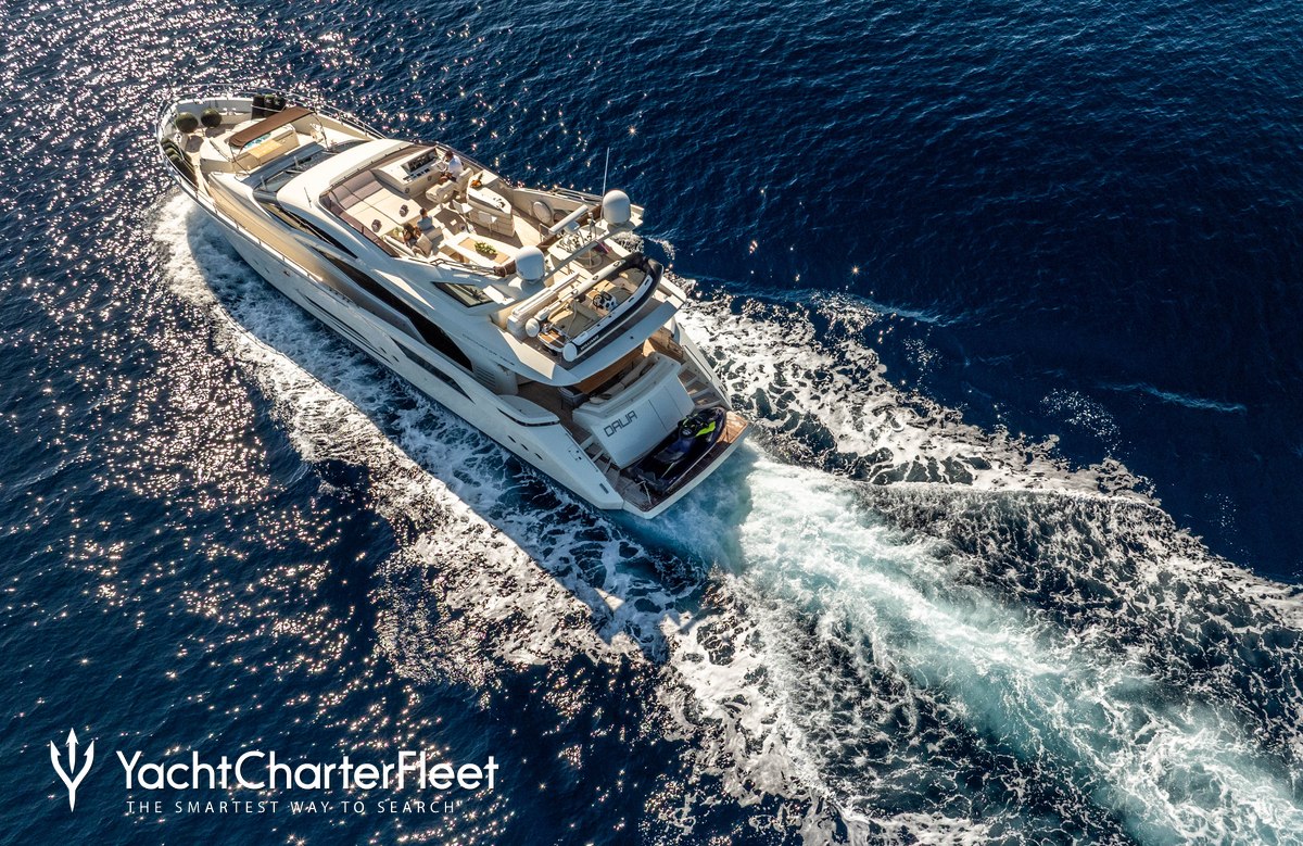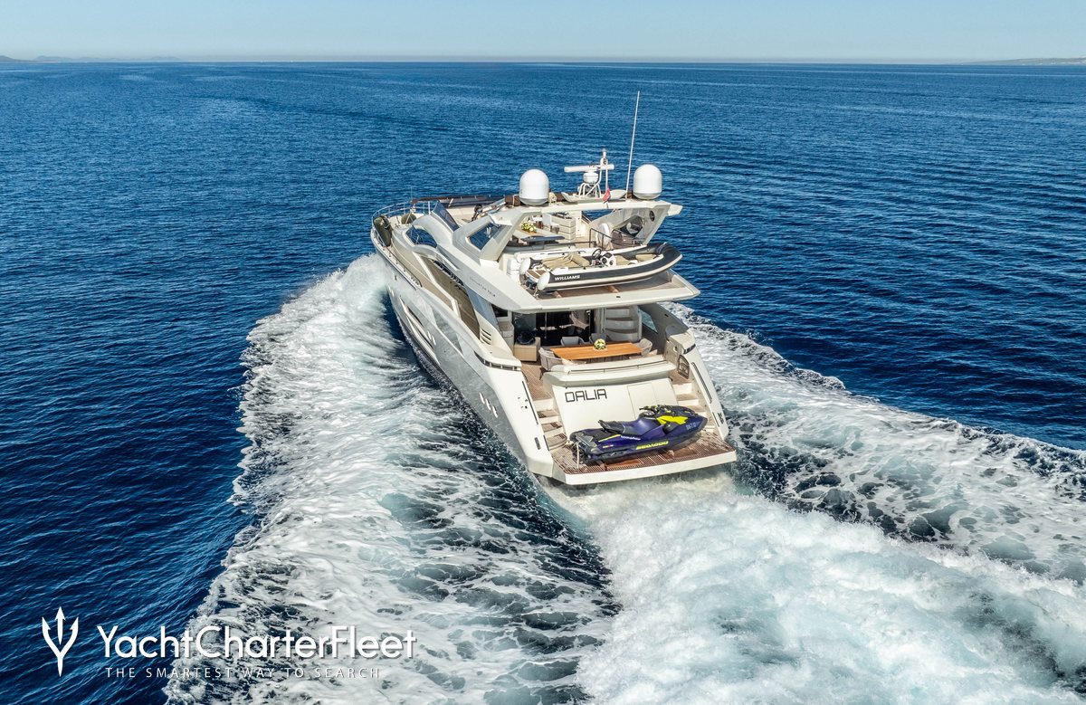 The 23.1m/75'9" 'Dalia' motor yacht built by the Italian shipyard Dominator is available for charter for up to 8 guests in 4 cabins.