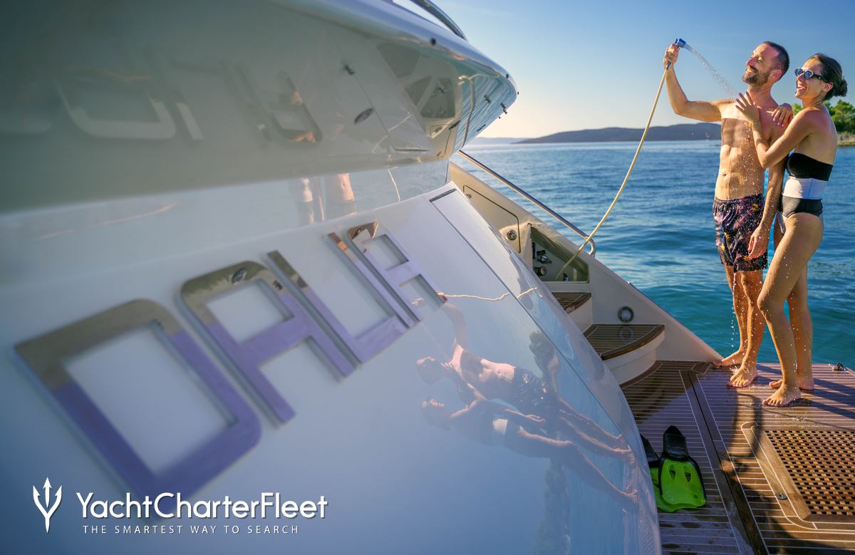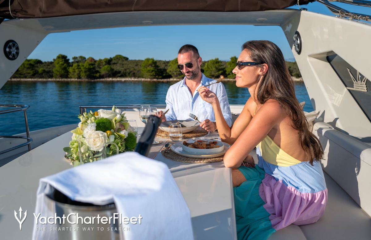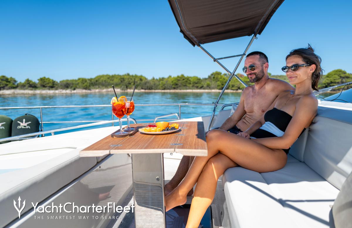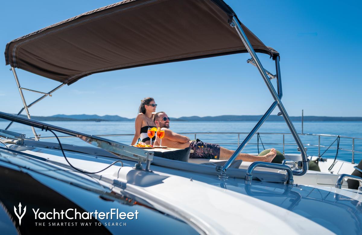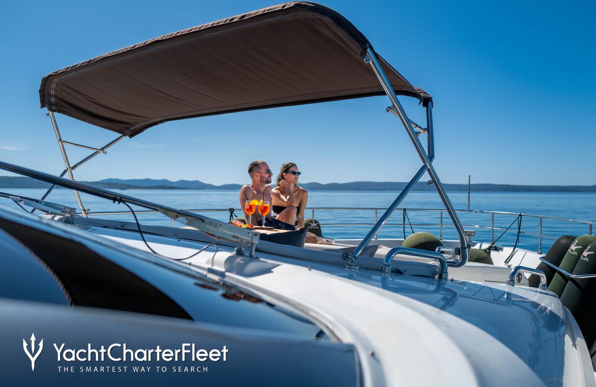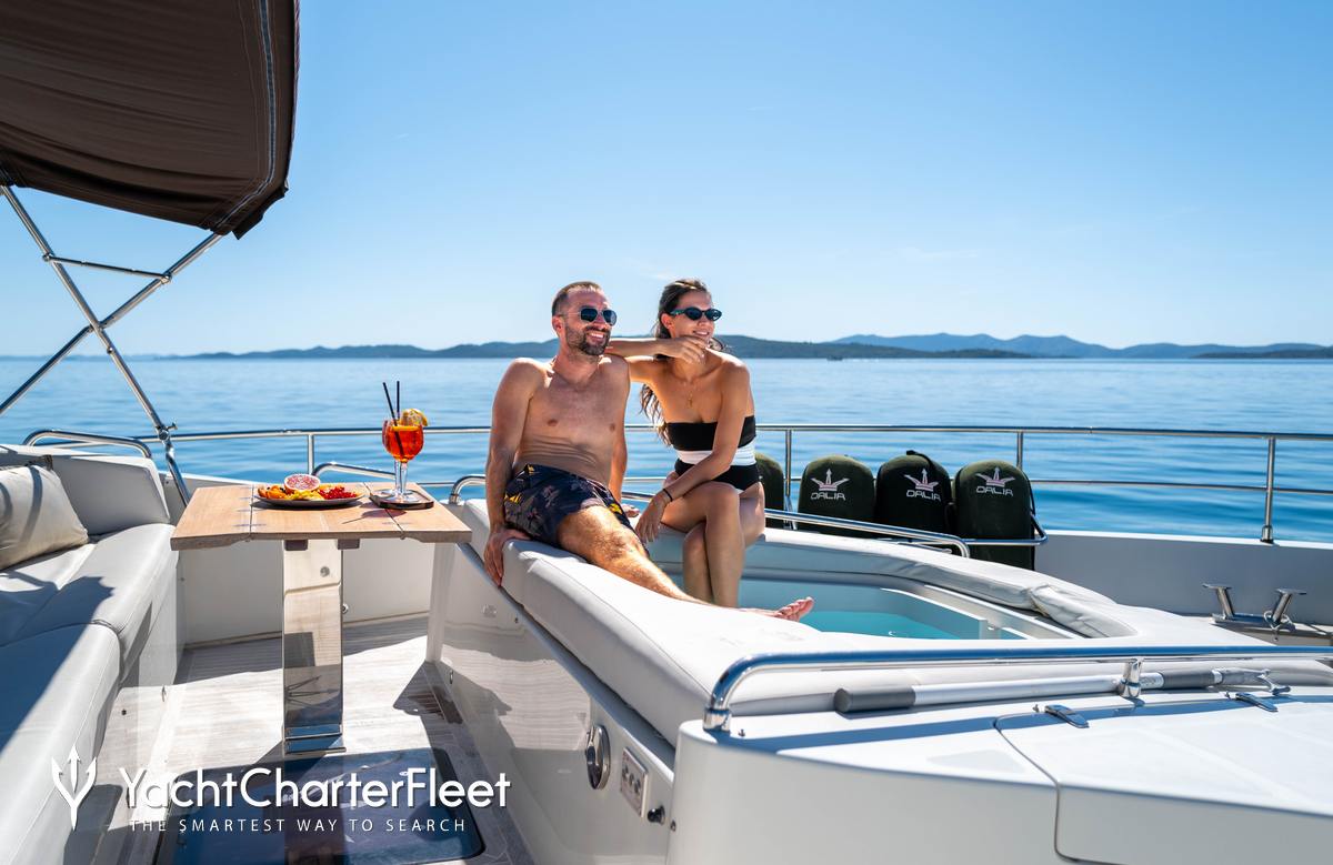 A charter on Dalia is comfortable and convenient thanks to the provided amenities such as a deck jacuzzi, perfect to enjoy the scenery with your favourite drink in hand.